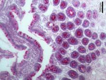 Corte de intestino delgado coloreado con PAS. En la foto de...