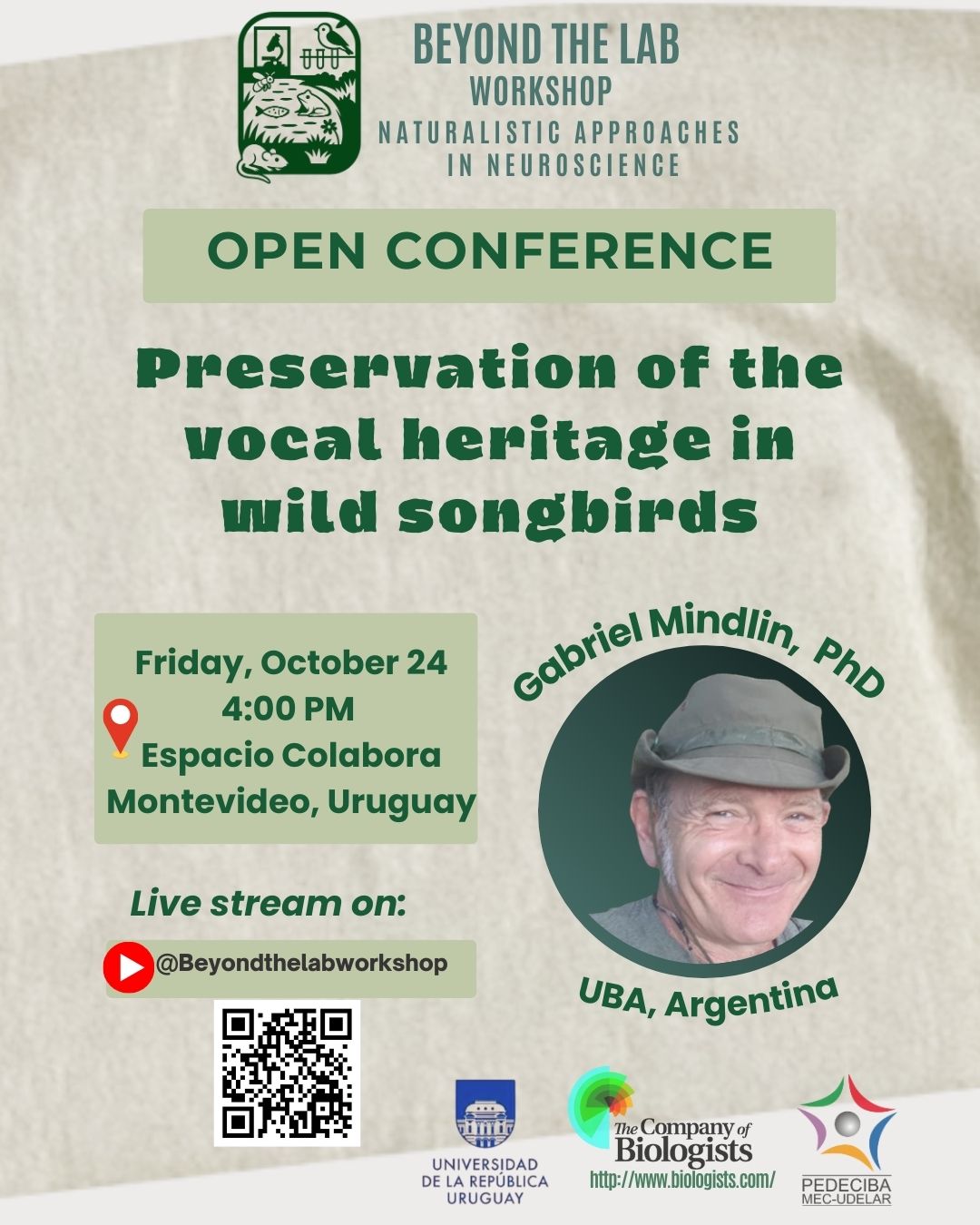 En el marco del Beyond the lab Workshop: Naturalistic Approaches in Neuroscience, tenemos el agrado de invitarlos a la conferencia abierta del Dr. Gabriel Mindlin, investigador de la Universidad de Buenos Aires (Argentina), titulada: